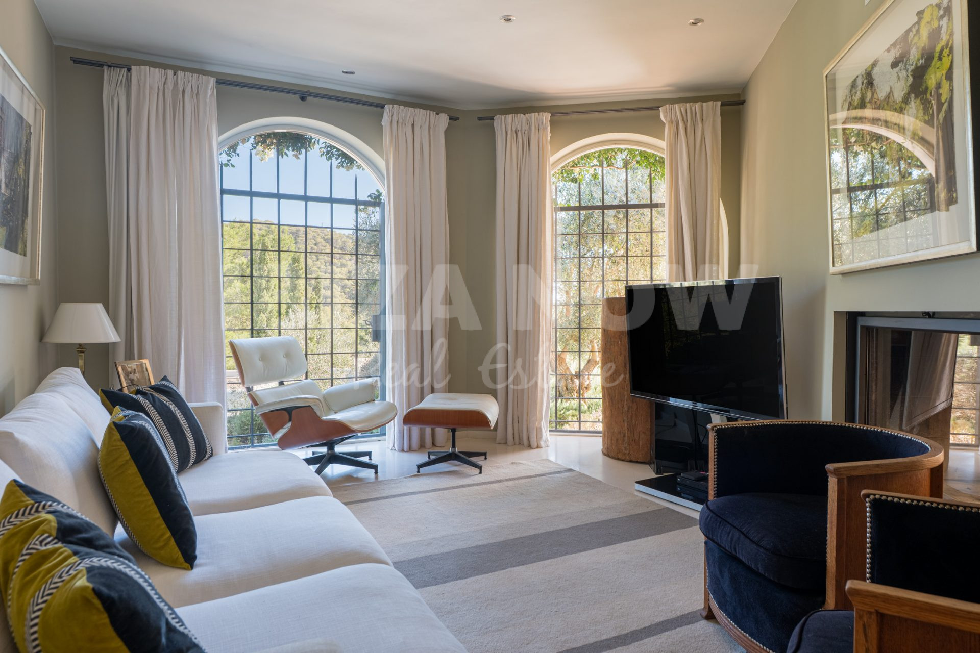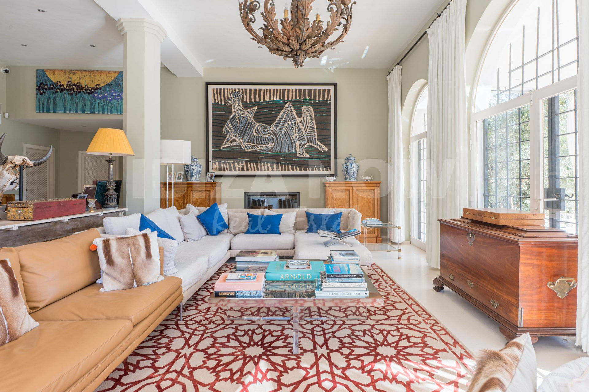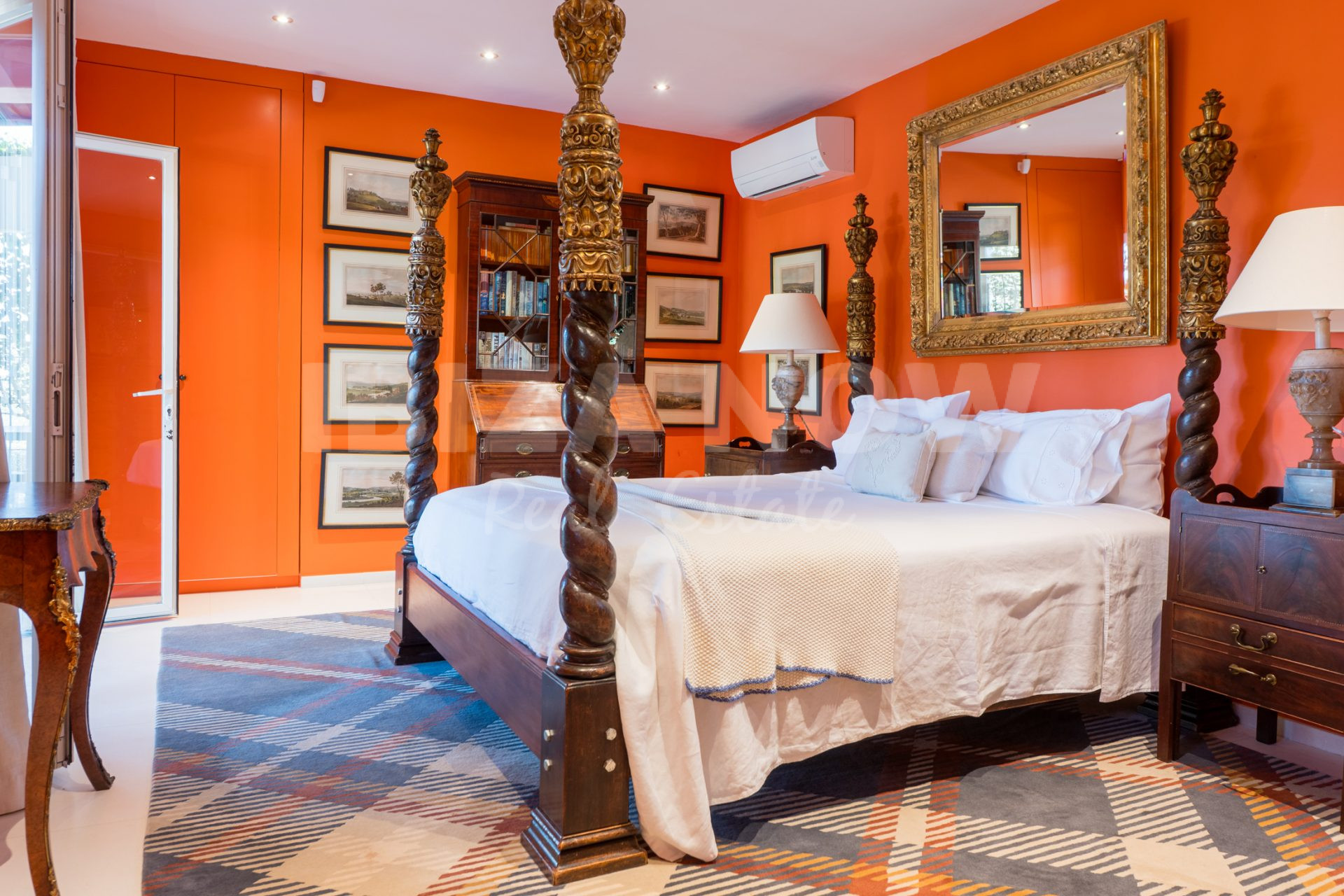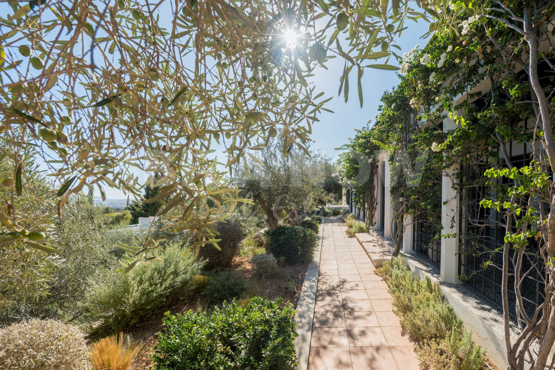 The main house centres around a striking double-height living room that opens directly onto a south-facing pergola. A sitting room and a fully equipped kitchen with pool access complete this level. Two en-suite bedrooms with high ceilings are located in the main residence, while five further suites are spread across separate wings and annexes. Among them is a self-contained apartment with kitchenette and office, offering additional privacy and flexibility.