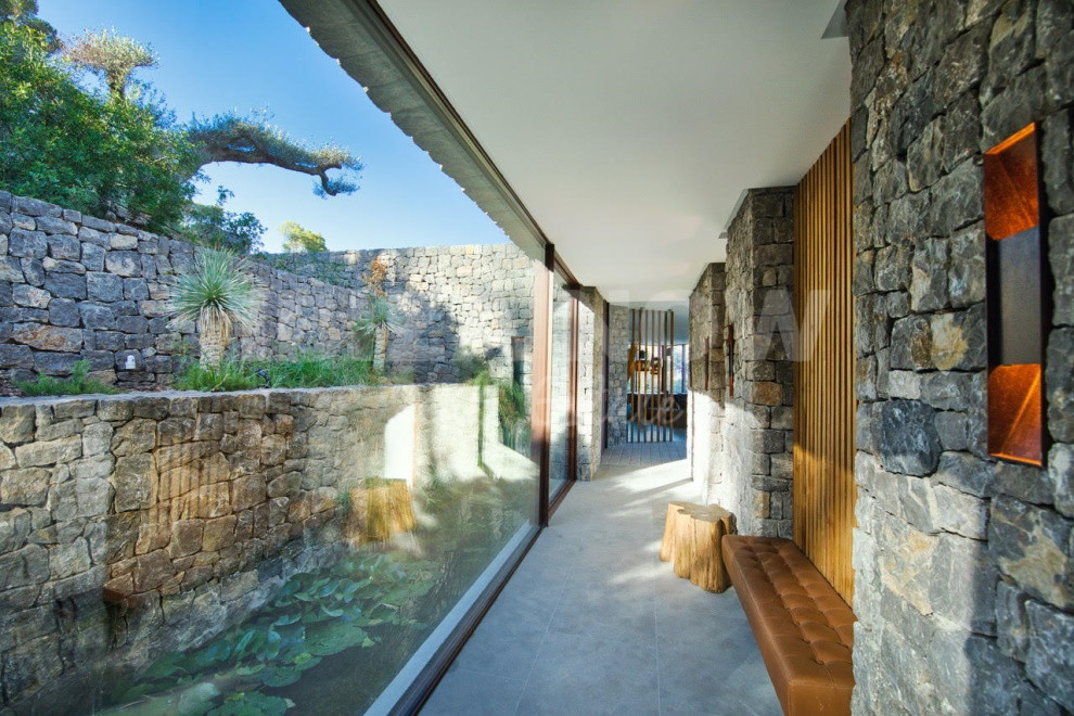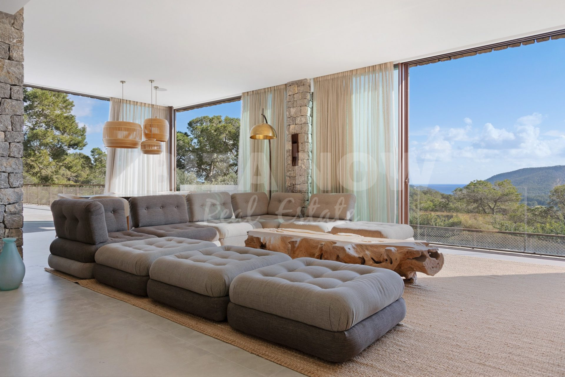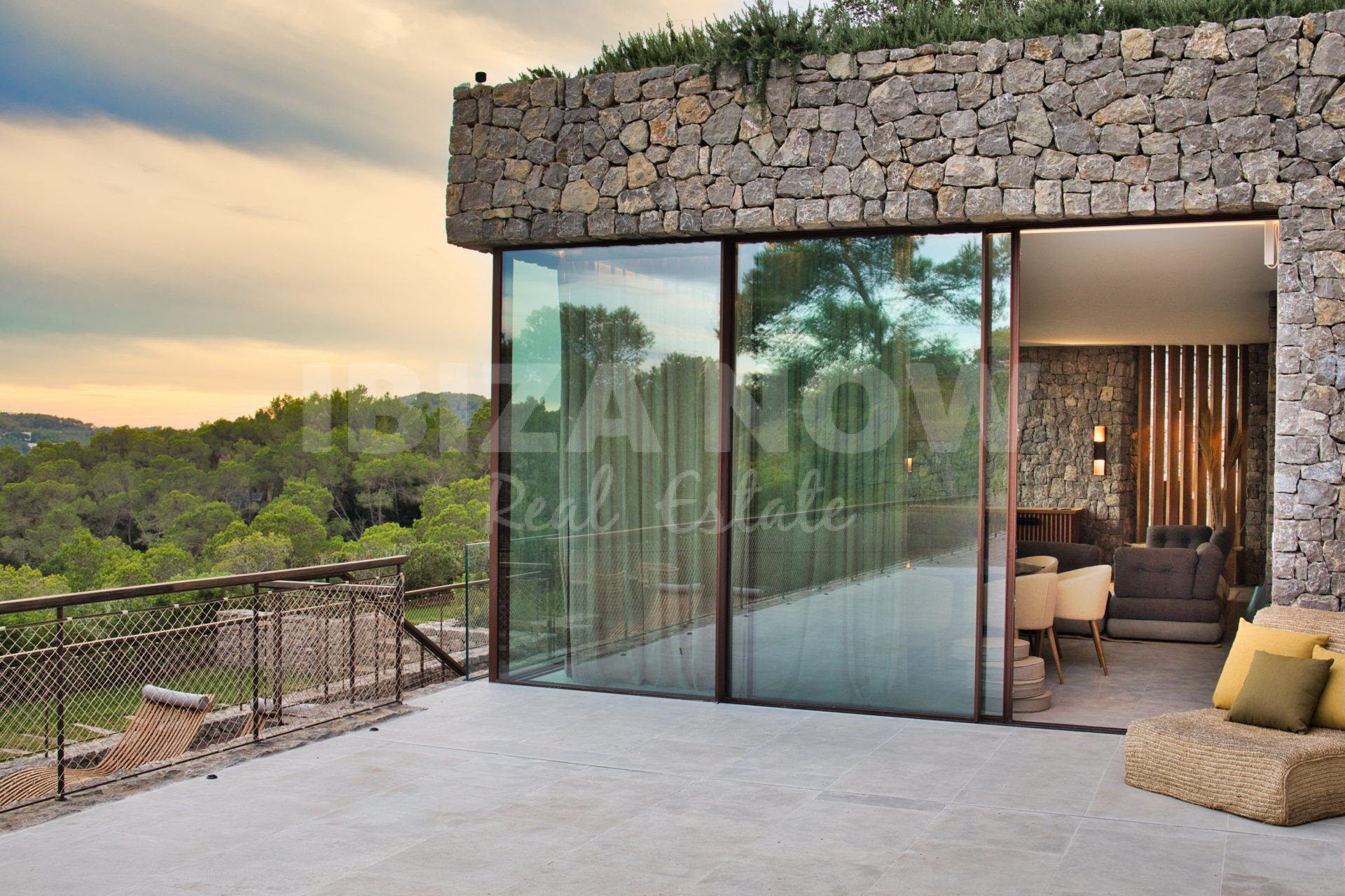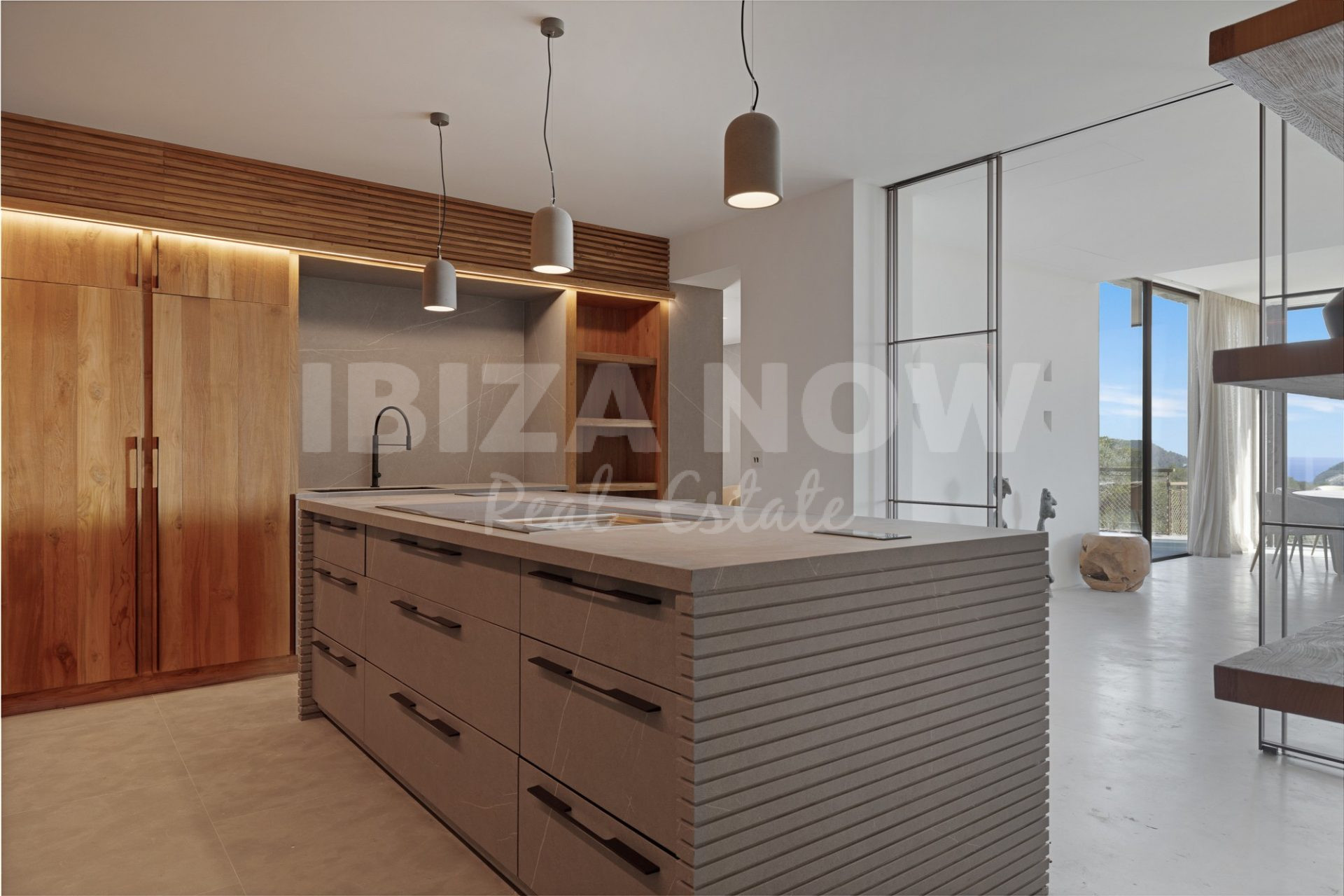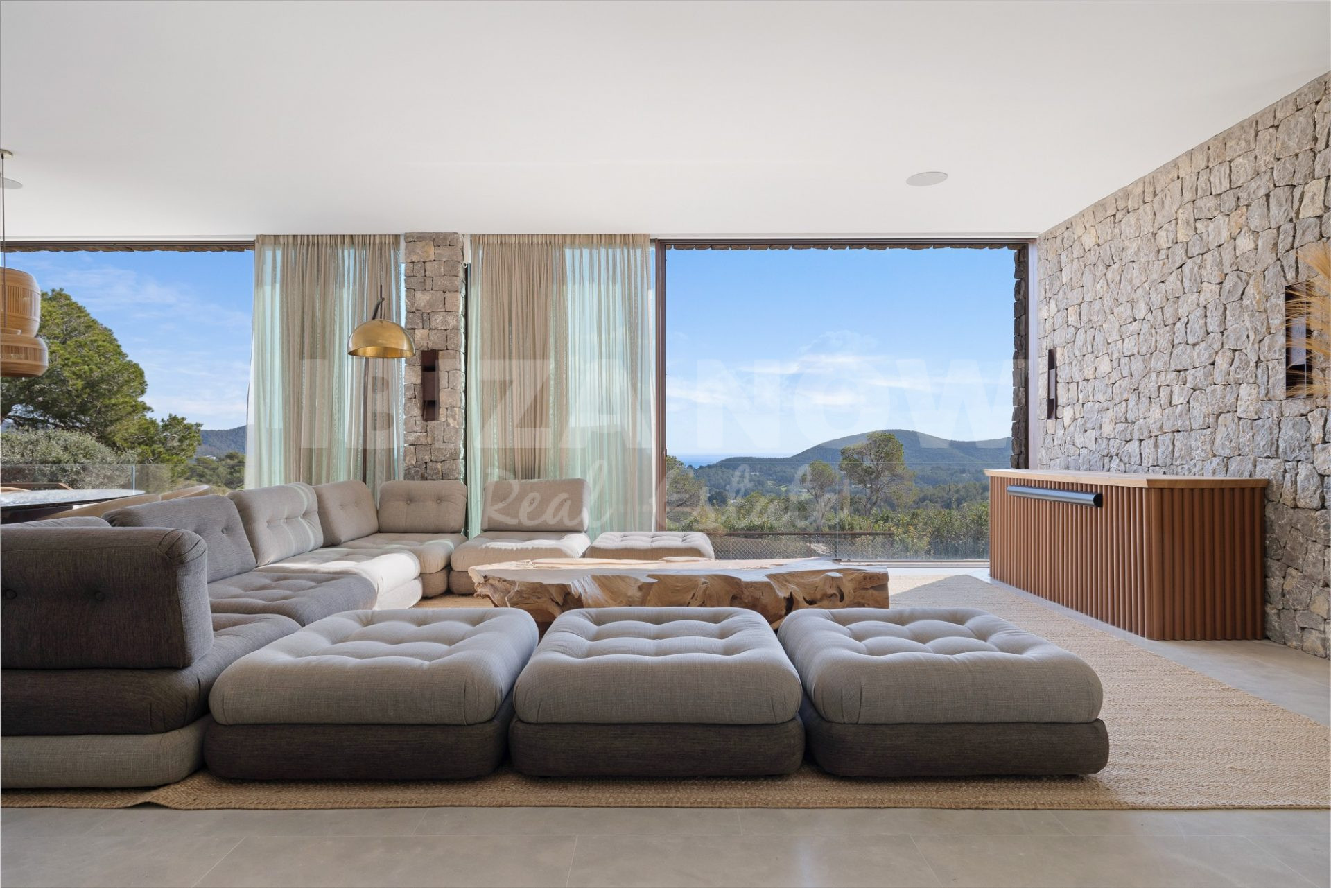 Perched high in the mountains with sweeping views across the valley to the sea, this villa is designed with natural materials of the highest quality. Each bedroom includes an en-suite bathroom and a walk-in closet, while the open-plan kitchen connects to an air-conditioned wine cellar — a paradise for wine lovers. Expansive terraces, an outdoor kitchen, and a spectacular pool complete the experience, blending modern luxury with Ibiza’s natural charm.