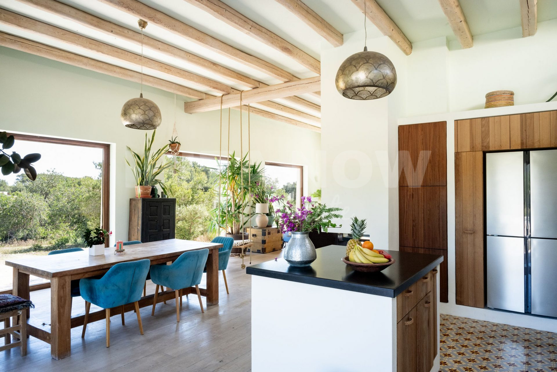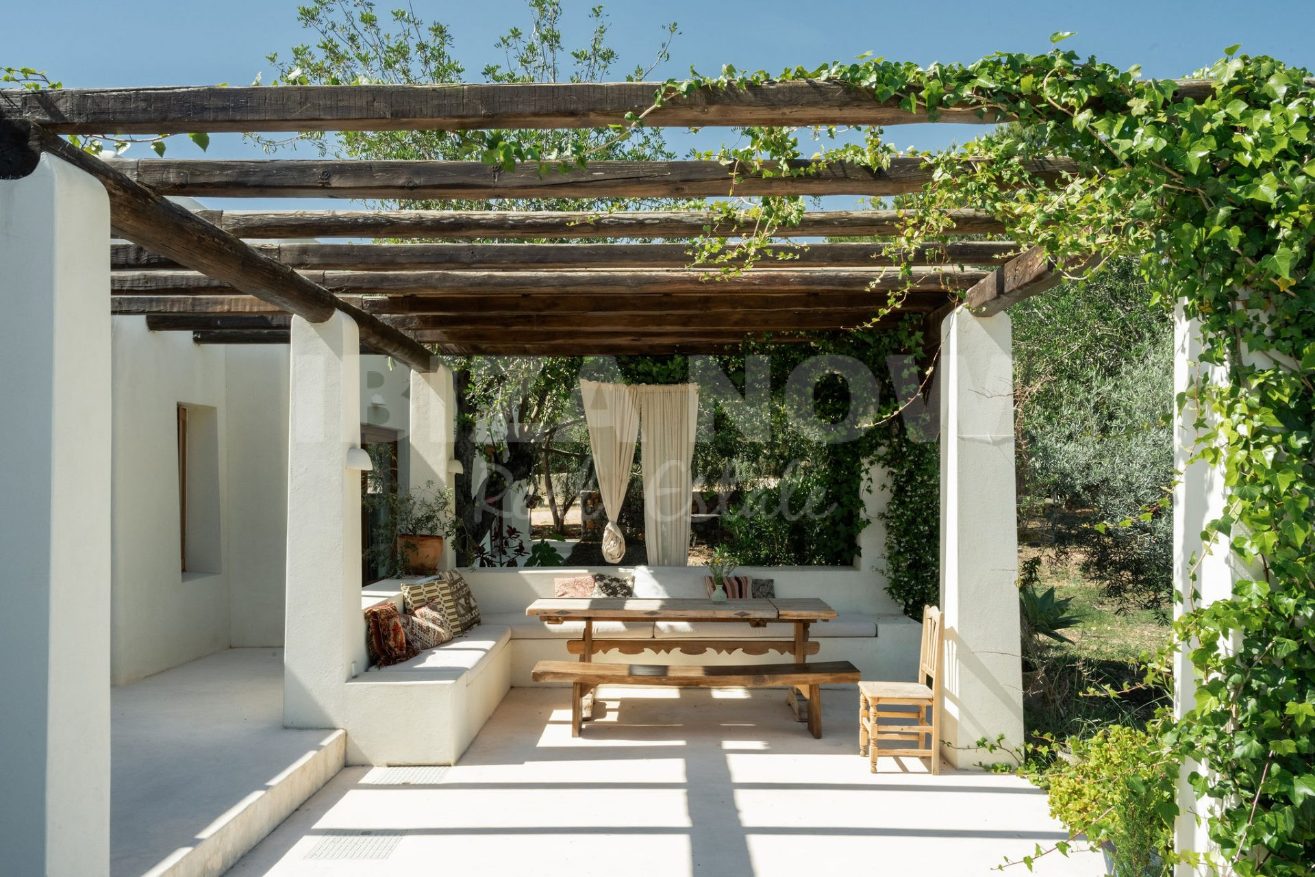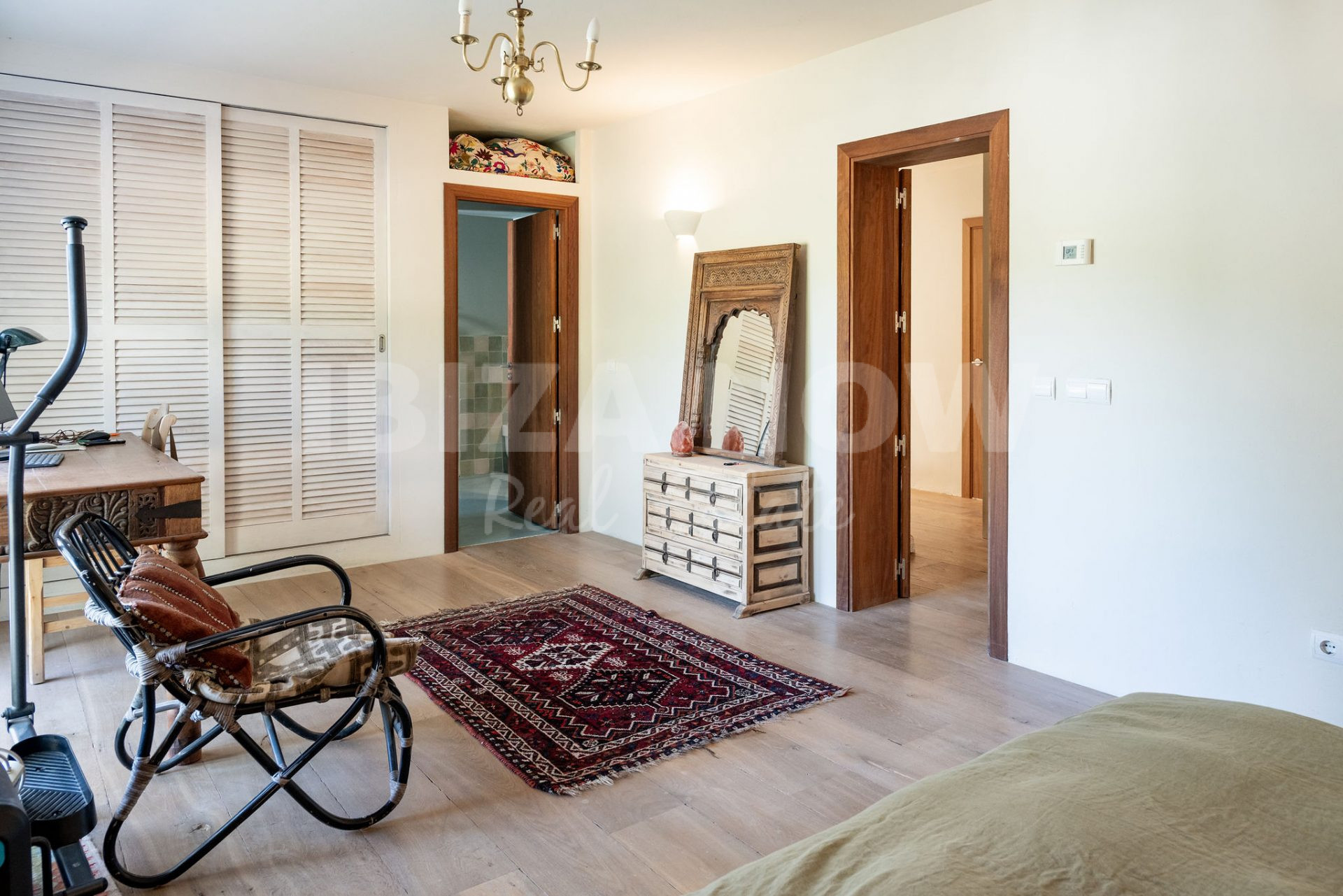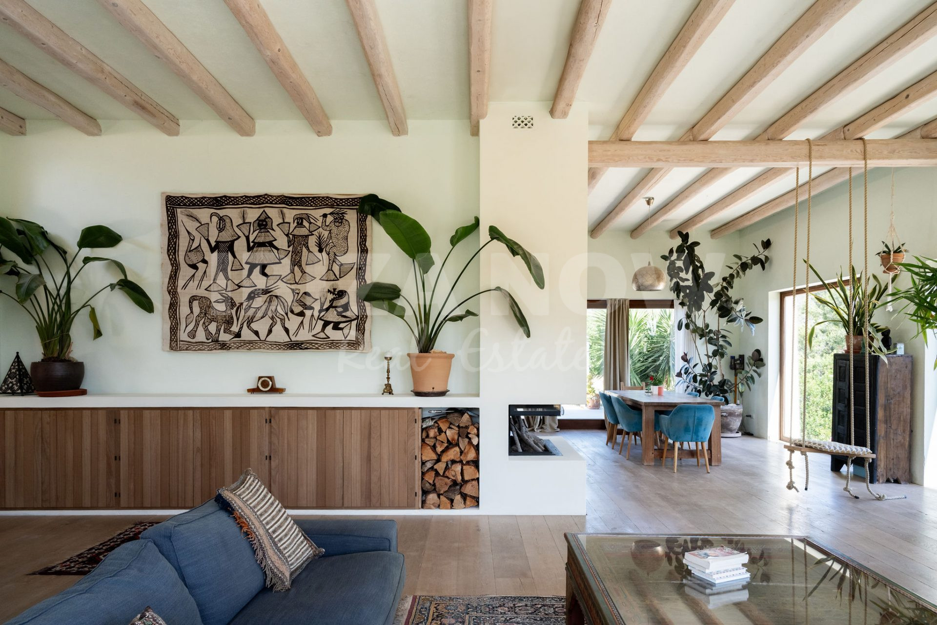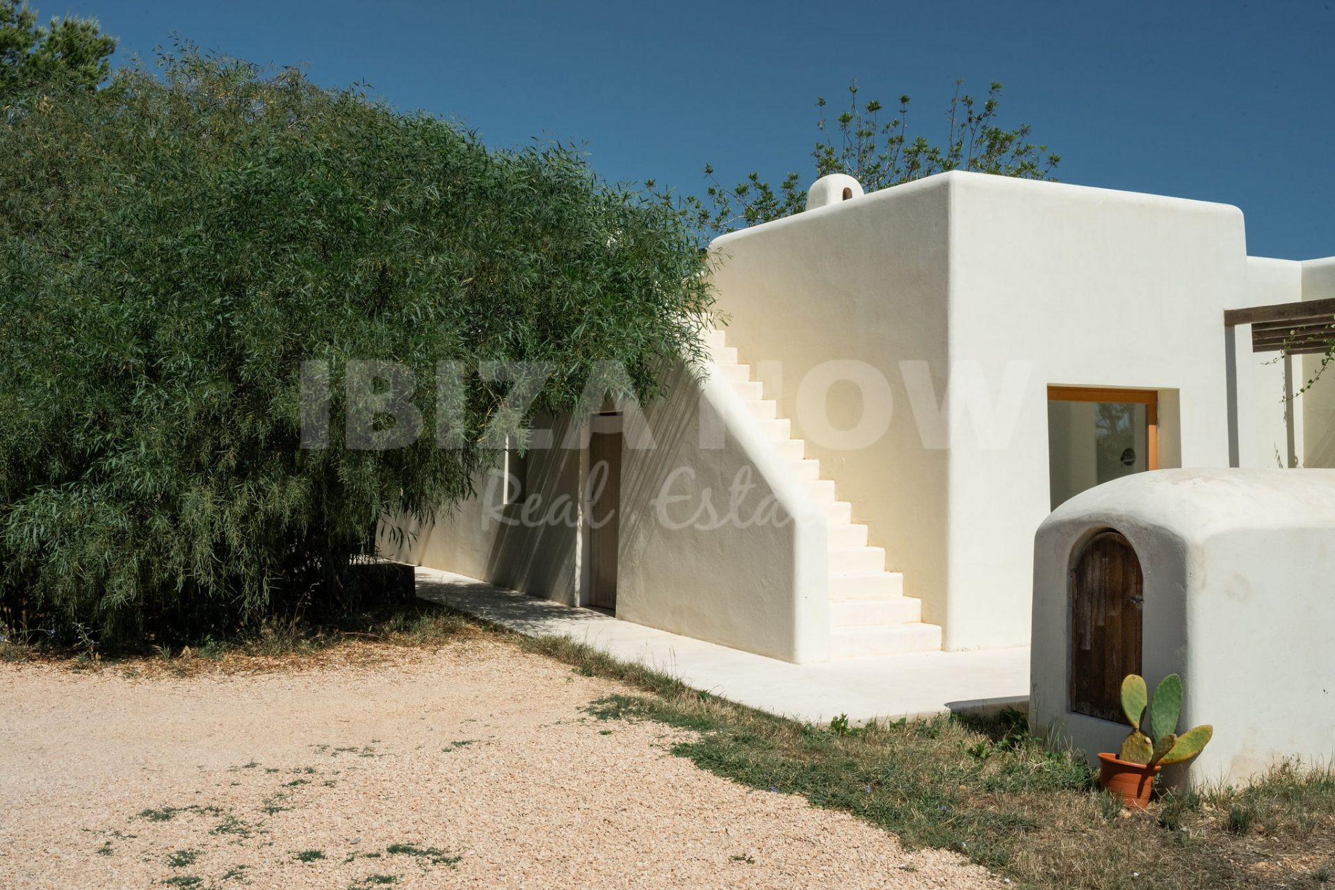 This beautifully renovated villa of 380 m² is set on a generous rustic plot of 15,000 m², just a 5-minute walk from Es Figueral beach. Fully refurbished in 2016, the property combines modern comfort with timeless charm, all on a single level.