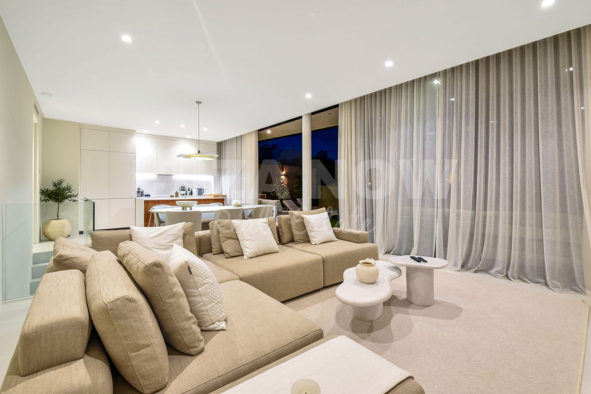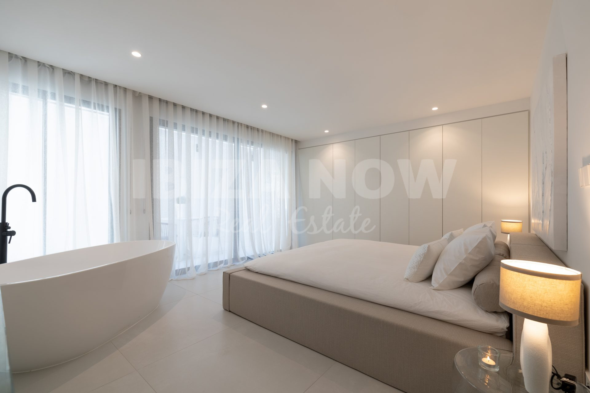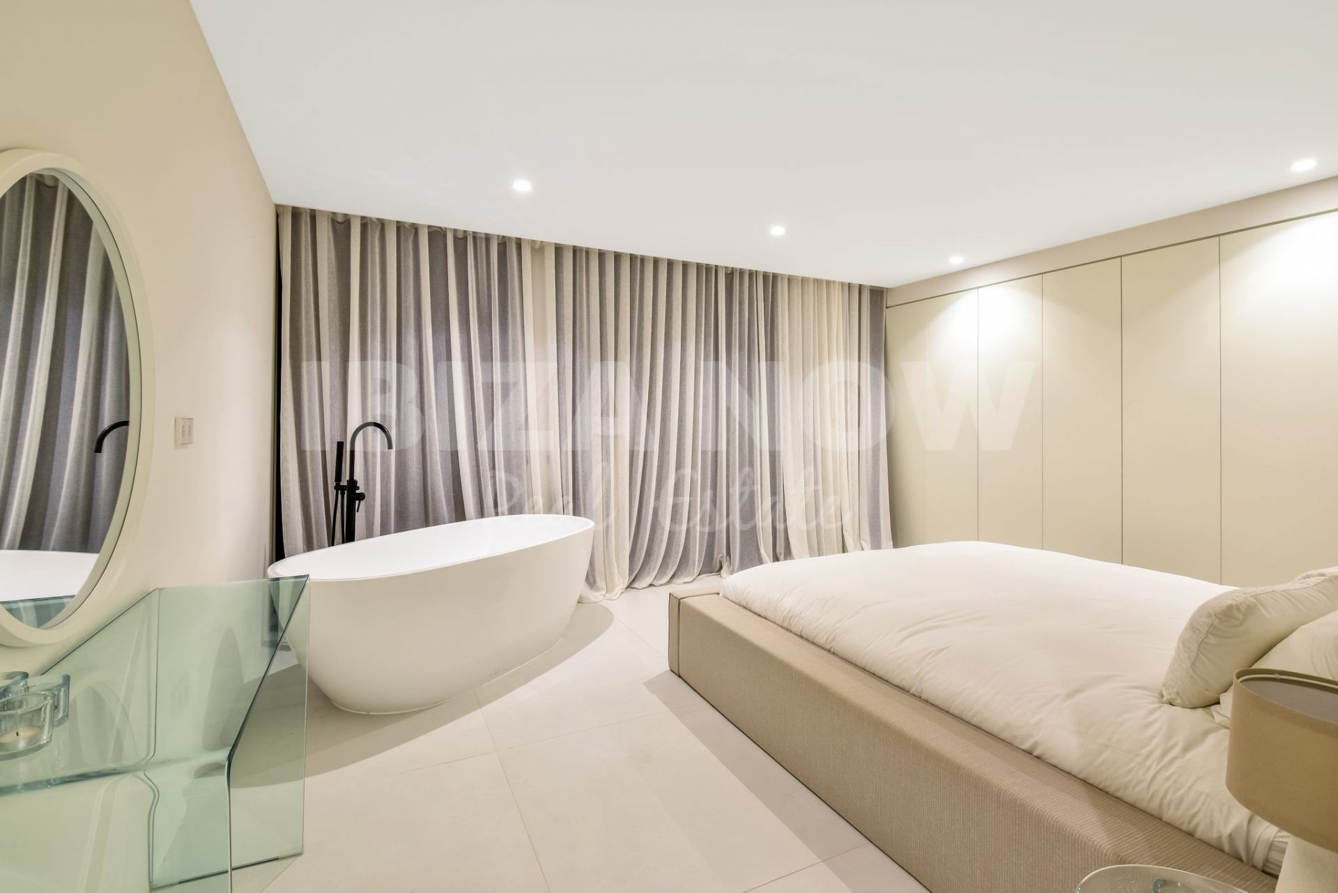 De open keuken is volledig uitgerust met premium apparatuur en sluit aan op de woonruimte, die direct toegang biedt tot het terras en de tuin. Dubbel glas zorgt voor uitstekende isolatie en geluidsreductie, terwijl airconditioning en centrale verwarming het hele jaar door een aangenaam binnenklimaat garanderen. Alle slaapkamers beschikken over ingebouwde kasten en de badkamers zijn afgewerkt met moderne voorzieningen.