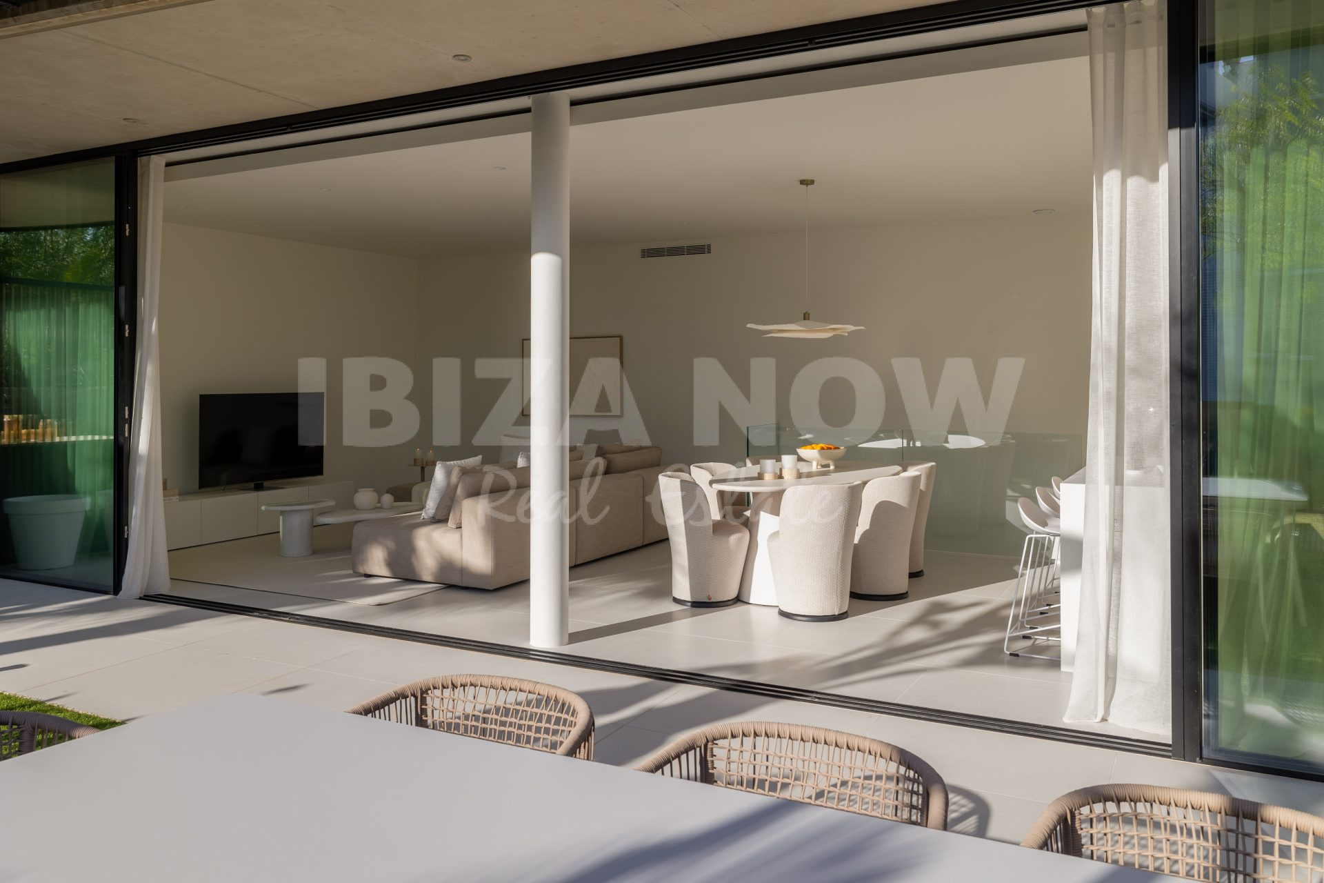 De residentie wordt omgeven door zorgvuldig aangelegde tuinen die de verbinding met de natuurlijke omgeving versterken. Inheemse beplanting en architectonische elementen creëren een aangename buitenruimte, terwijl het gemeenschappelijke zwembad een plek biedt om te ontspannen en te genieten van de Ibiza-levensstijl.