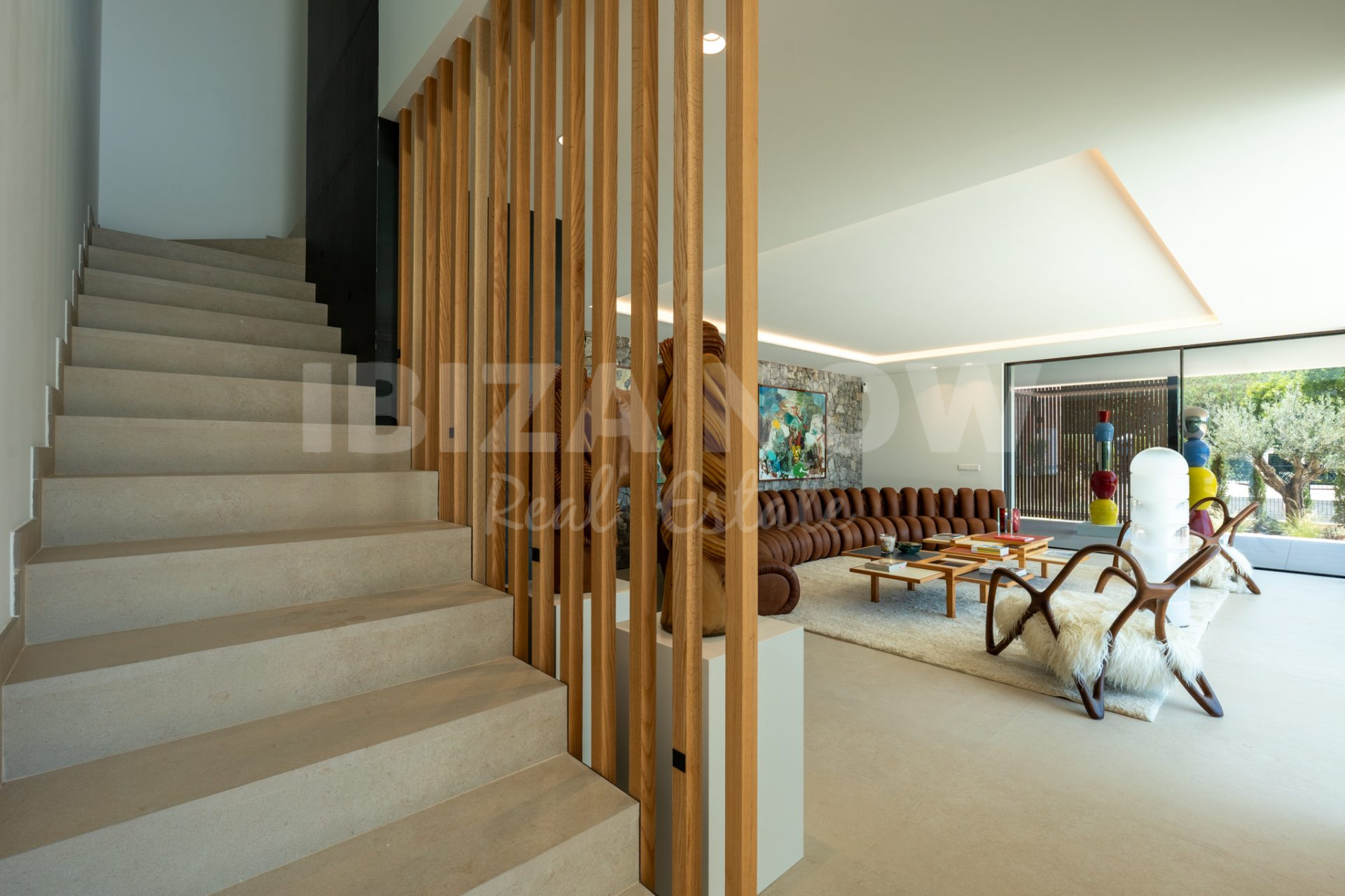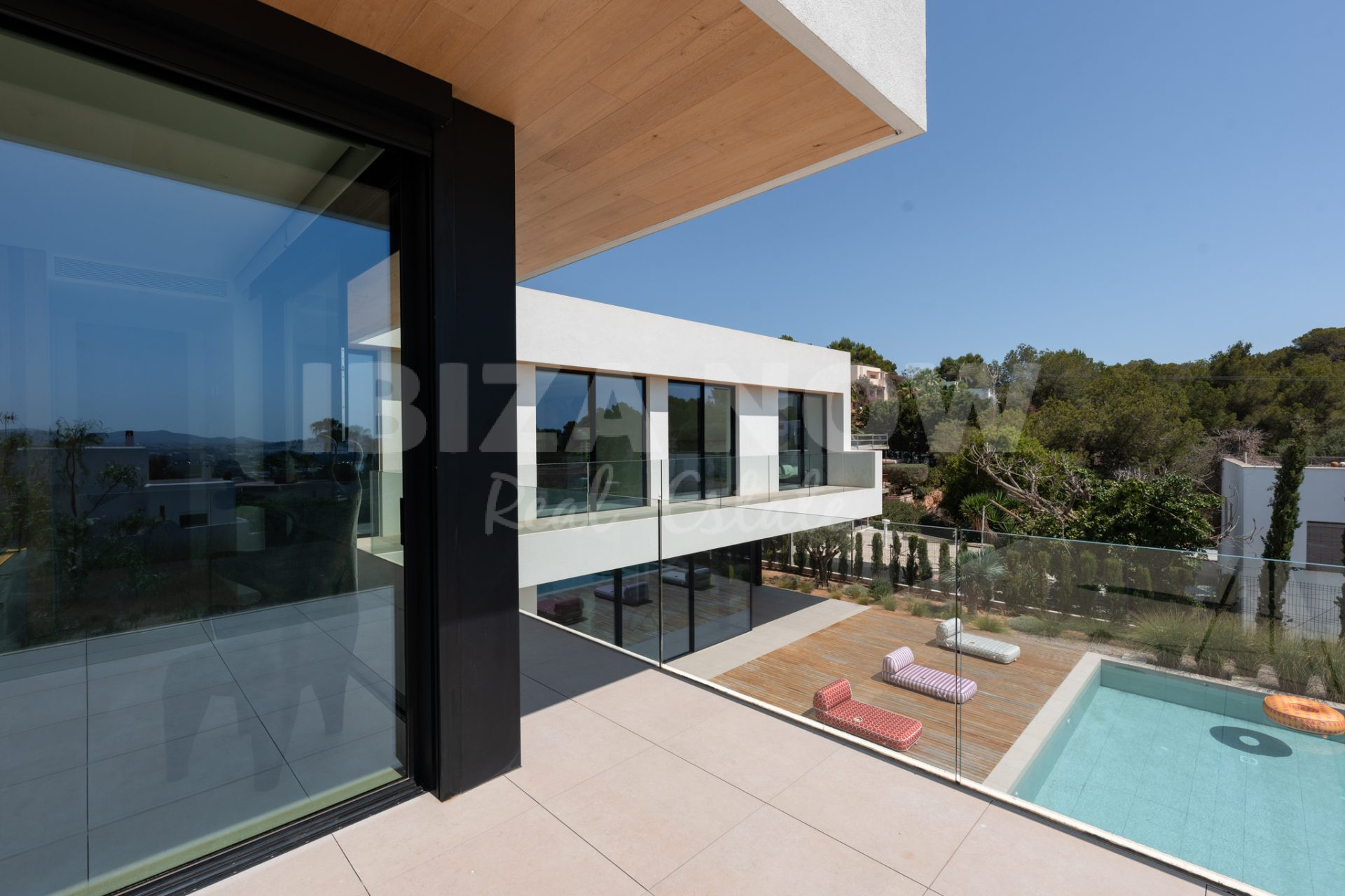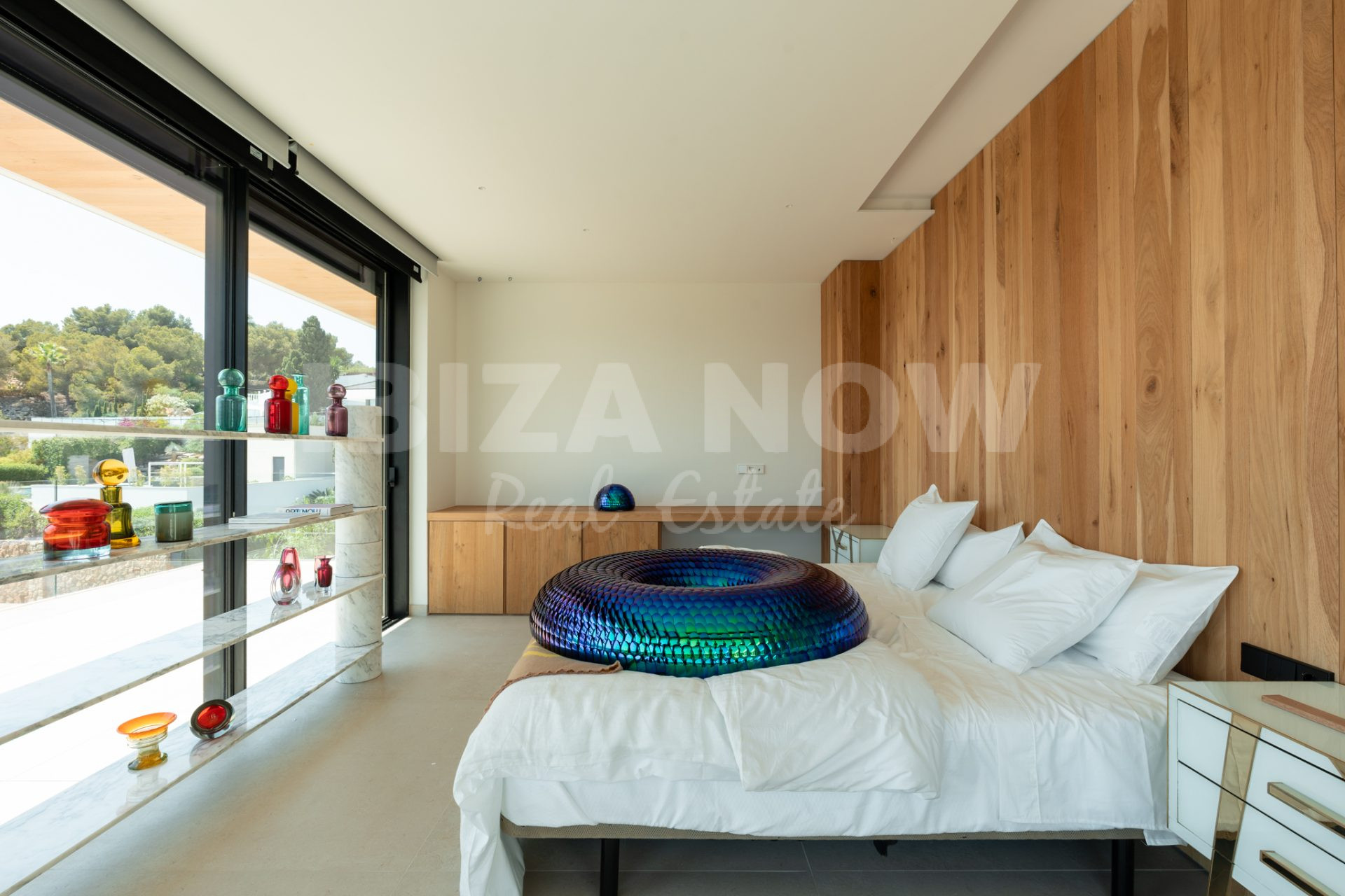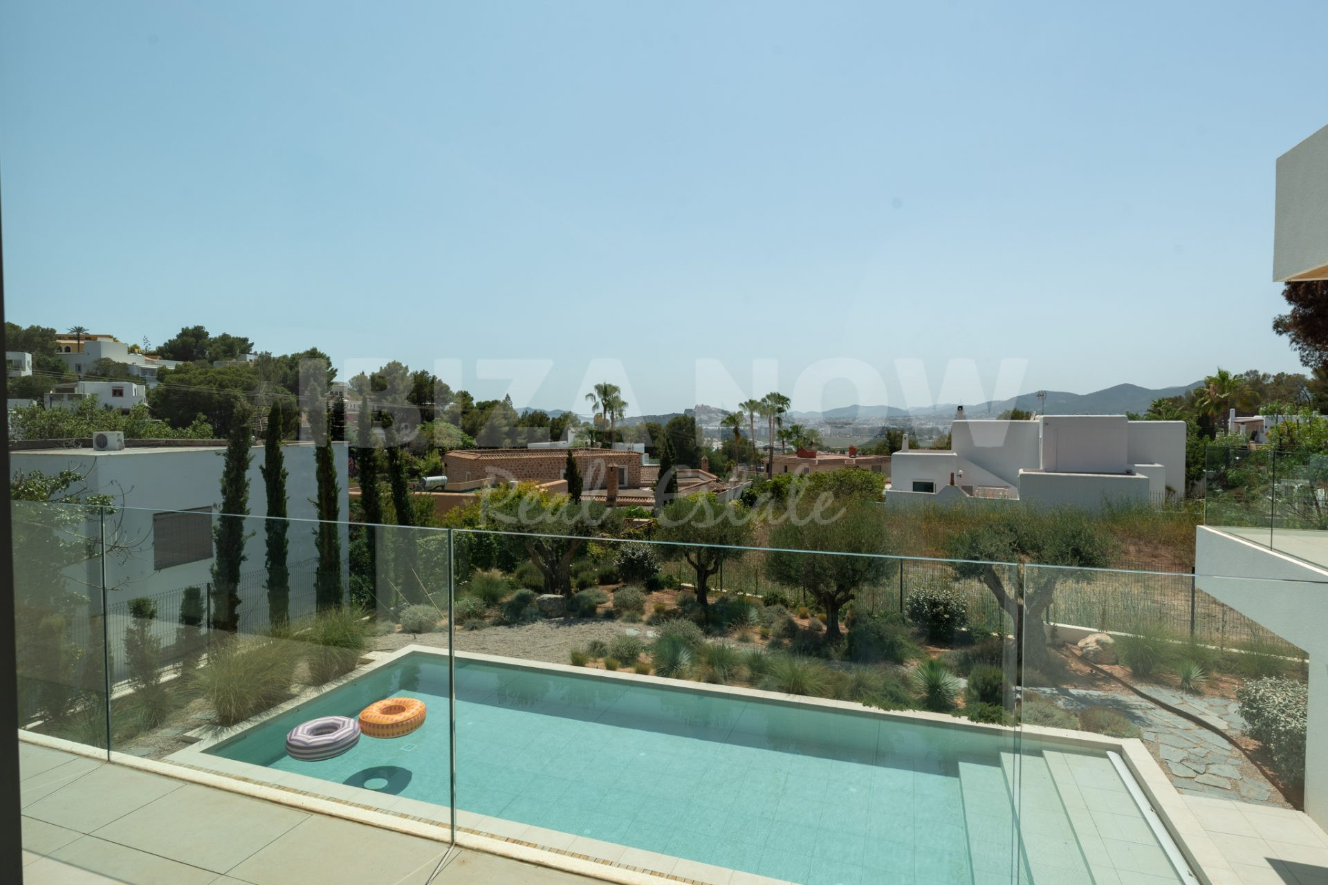 Op de begane grond bevindt zich een ruime woonkamer met open keuken, direct verbonden met meerdere terrassen, de groene tuin en het zwembad. De open indeling en grote raampartijen zorgen voor een luchtig, natuurlijk gevoel. Op de bovenverdieping bevinden zich zes slaapkamers, elk met en-suite badkamer en ingebouwde kasten. Vanaf deze verdieping geniet je van een spectaculair uitzicht op zee en Dalt Vila - het ultieme Ibiza-gevoel.