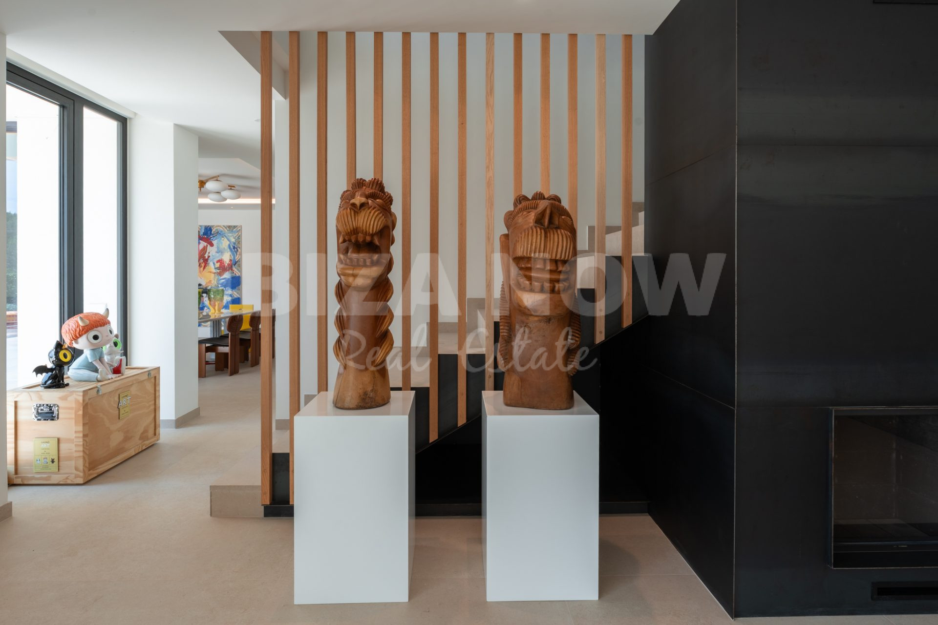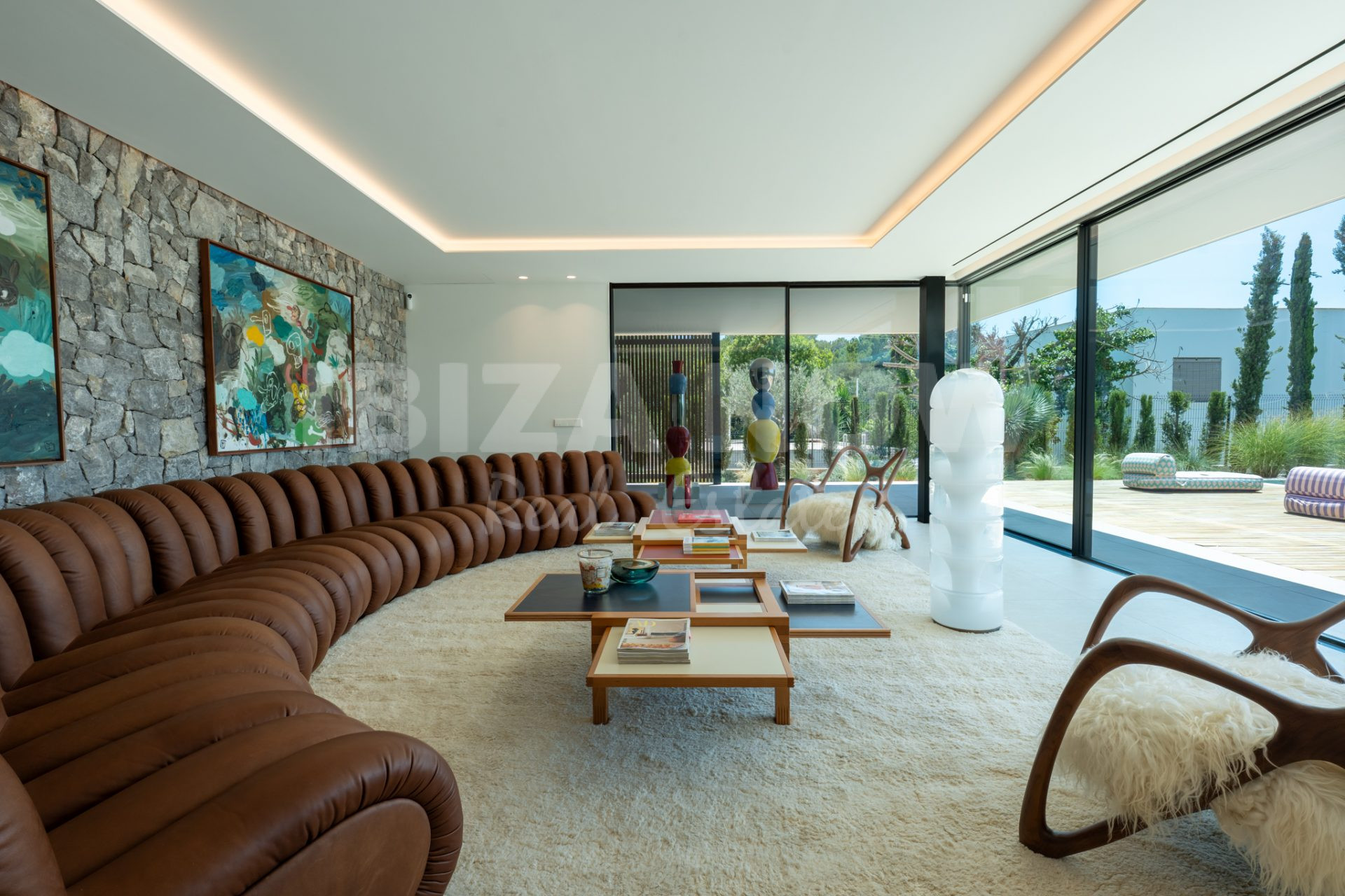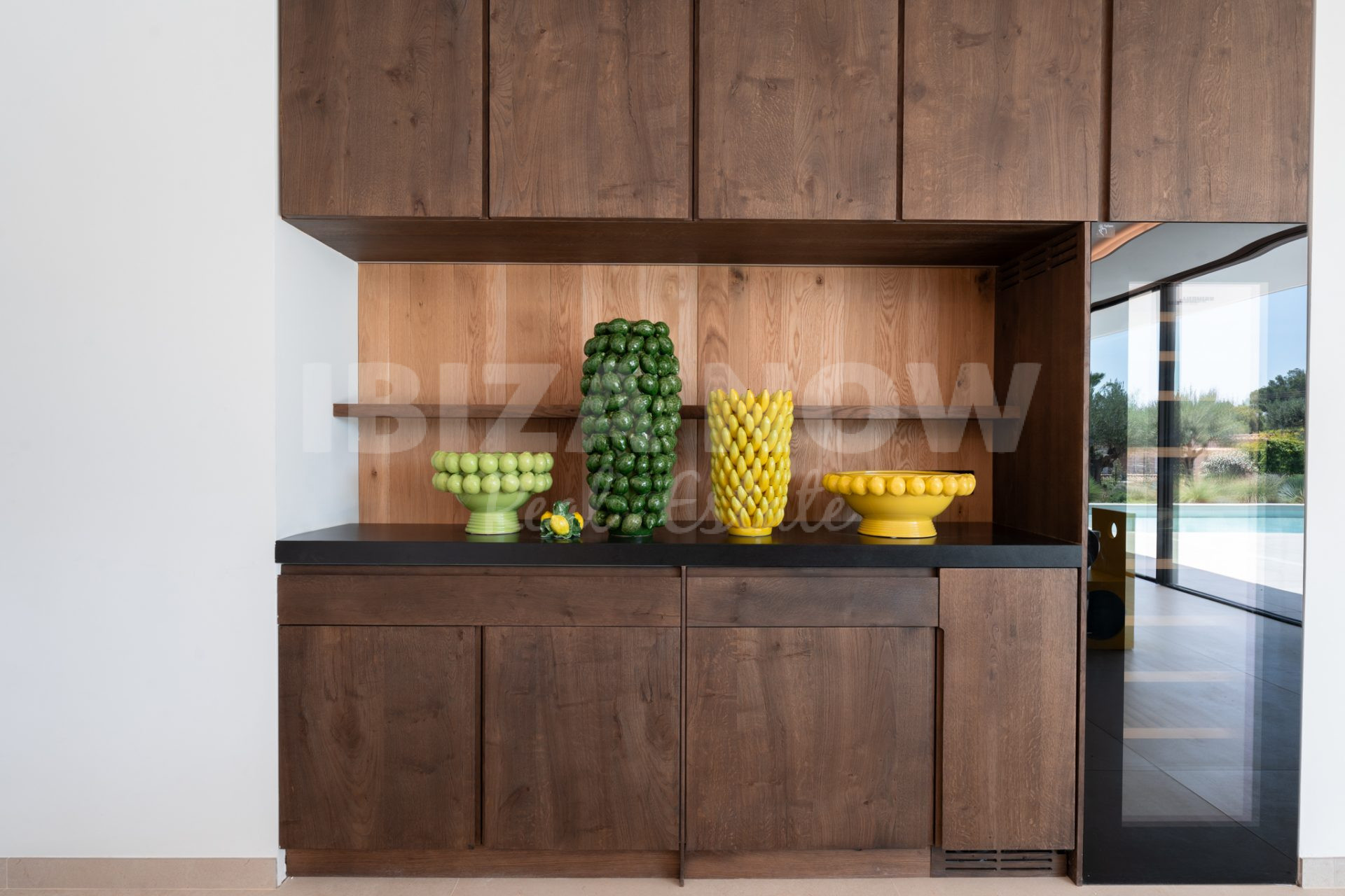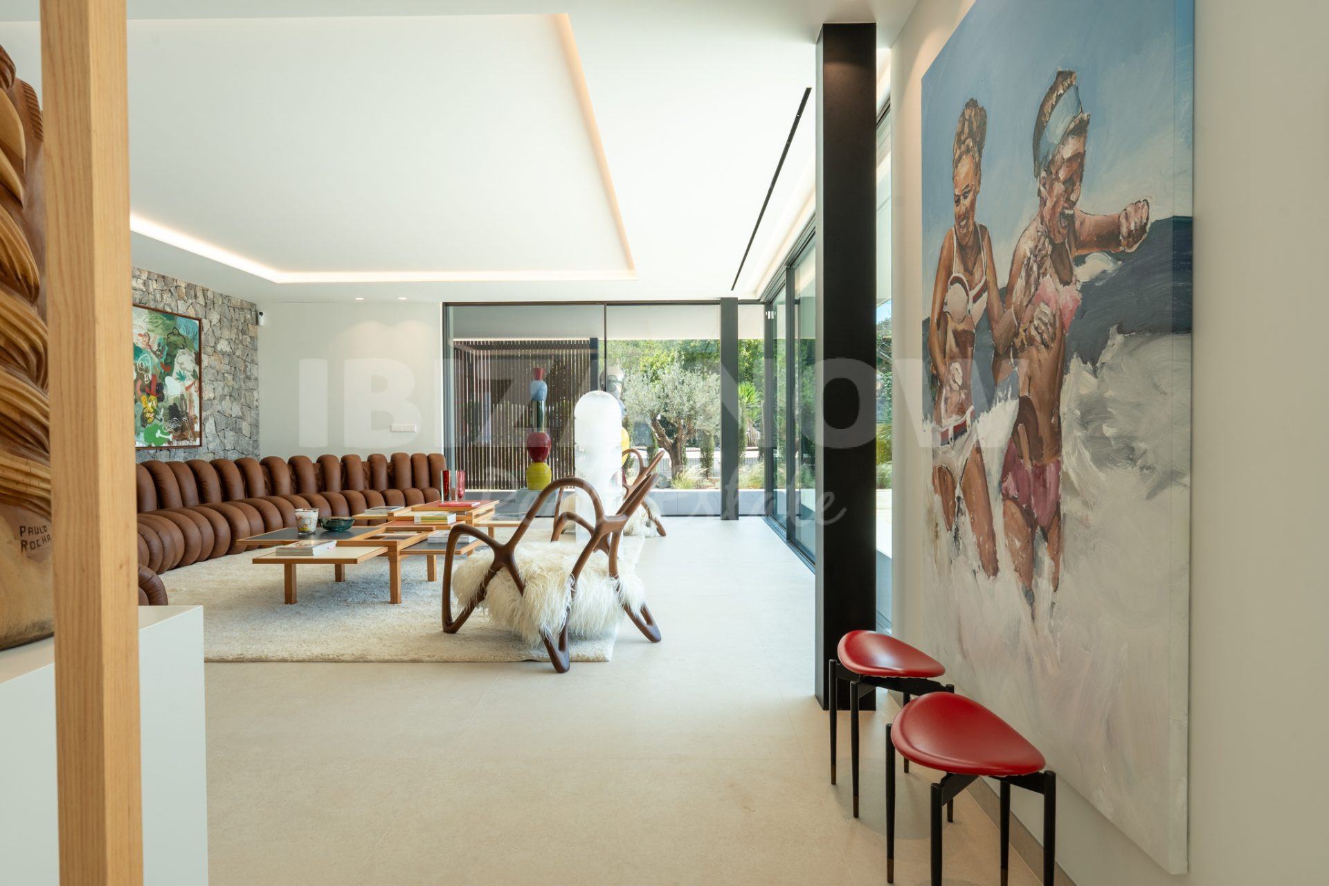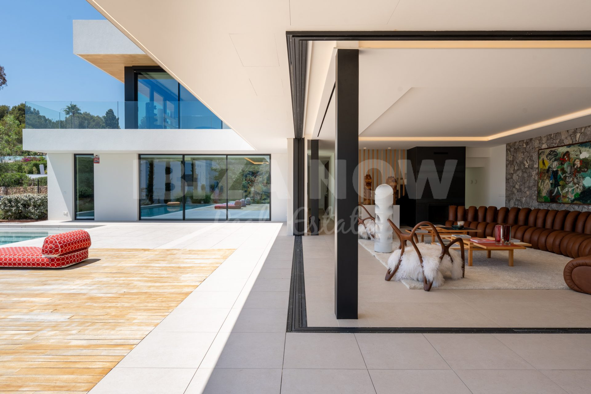 Op de begane grond bevindt zich een ruime woonkamer met open keuken, direct verbonden met meerdere terrassen, de groene tuin en het zwembad. De open indeling en grote raampartijen zorgen voor een luchtig, natuurlijk gevoel. Op de bovenverdieping bevinden zich zes slaapkamers, elk met en-suite badkamer en ingebouwde kasten. Vanaf deze verdieping geniet je van een spectaculair uitzicht op zee en Dalt Vila - het ultieme Ibiza-gevoel.